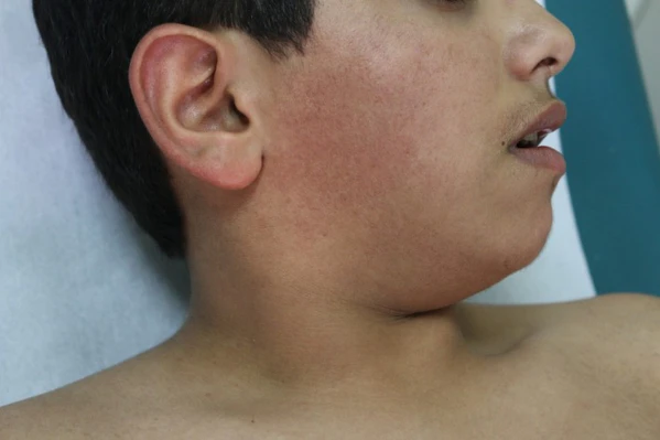 Высыпания локализуются преимущественно симметрично в предушной и околоушной областях, на щеках и подбородке; реже вовлекаются виски, лоб, боковые поверхности и передняя часть шеи. В отдельных случаях поражение распространяется на ушные раковины, брови или туловище[1][2].