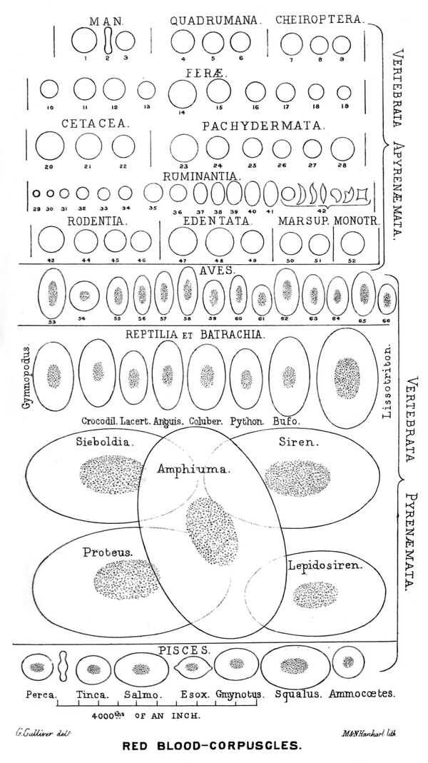 Эритроциты птиц и пресмыкающихся, в отличие от эритроцитов млекопитающих (за исключением верблюдовых) — овальной формы[9]. У всех позвоночных, кроме млекопитающих, зрелые эритроциты имеют ядра. У большинства групп (кроме птиц) они крупнее эритроцитов млекопитающих.