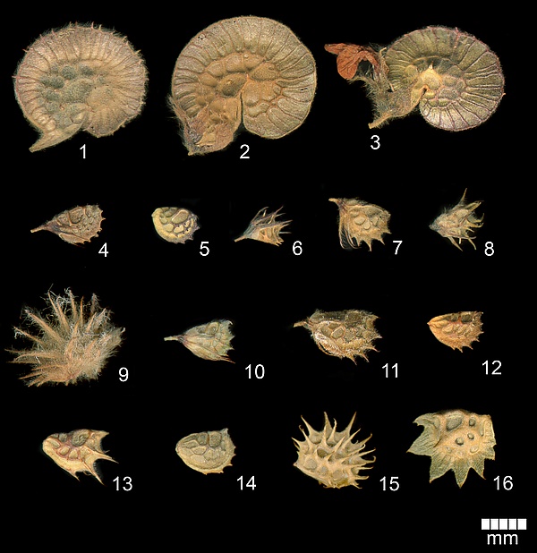 Боб одно-, реже 2-3-семянный, одногнездный, очень редко двугнездный, нераскрывающийся, кожистый, не бывает членистым, полуокругленный или м.б. изогнутый или свернут улиткой, обычно с гребешком, по диску ячеистый, часто вооружен шипами[3].