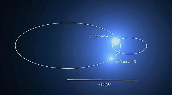 Размеры звезды в двойной системе должны соответствовать расстоянию между двумя компаньонами, которое в периастре составляет всего 250 солнечных радиусов. Радиус аккреции второй звезды должен составлять 60 солнечных радиусов, что предполагает сильную аккрецию вблизи от периастра, приводящую к коллапсу звёздного ветра Эты Киля B[13]. Было предположено, что изначальное прояснение с 4-ой звёздной величины до 1-ой относительно постоянной болометрической светимости было нормальной вспышкой ЯГП, хотя и чрезмерно экстремальной для этого класса. Затем звезда-спутник прошла через расширенную фотосферу первой звезды в периастре, вызвав дальнейшее повышение яркости, повышение светимости и уровня потери массы в ходе «Великой вспышки»[101].