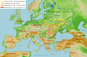 Во II—III веках славянские племена пшеворской культуры из Висло-Одерского региона мигрируют в лесостепные районы междуречья Днестра и Днепра, заселенные сарматскими и позднескифскими племенами, принадлежавшими к иранской языковой группе и вытесняют последних с их территории. Одновременно происходит перемещение на юго-восток германских племён гепидов и готов, в результате чего от нижнего Дуная до Днепровского лесостепного левобережья складывается полиэтничная черняховская культура с преобладанием славян. В процессе славянизации местных скифо-сарматов в Приднепровье формируется новый этнос, известный в византийских источниках как «анты».