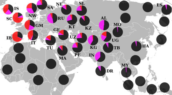 3. Данные гаплогрупп ДНК. У уйгуров высокая доля гаплогруппы R1b[3], наиболее распространенная на западе Европы, особенно у кельтских народов.