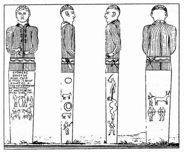 Памятник этот представляет молодого человека в шитой шапочке и в платье, похожем по покрою на нынешний бешмет с продольной строчкой. Застегнут он четырьмя четвероугольными застёжками и подпоясан кожаным узким поясом, прошитым посредине ниже лифа; платье идёт складками. Ноги не сделаны, но нижняя часть представляет столб с греческой надписью на передней стороне и множеством фигур, представляющих людей на охоте за зверями, воинские игры пеших и конных людей и с правой стороны колчан со стрелами, ниже пояса статуи, а с левой — сабля с рукояткой наподобие грузинской и лук в футляре. В этой греческой надписи можно многое разобрать и, между прочим, имя Баксана…