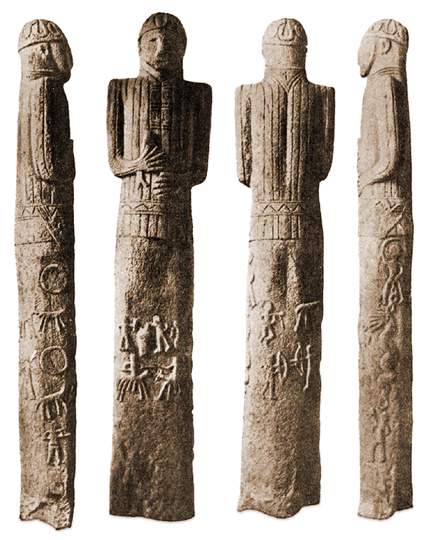 Монумент состоит из одного гранитного камня вышиною в 8 футов и 8 дюймов. Очень грубо изображает человеческую фигуру с руками до самого пояса, а ниже пояса видна надпись. Она тем более интересна, что начертана на неизвестном языке буквами, составленными частью из греческих, а частью из славянских. После подписи высечены разные грубые фигуры. Одна изображает двух рыцарей. Лицо у статуи похоже не на монгольское, ибо нос длинен, и не на черкесское, будучи слишком кругло. Но что всего любопытнее и что может привести к разным заключениям, то это изображение маленького креста, находящееся на задней части воротника[8].