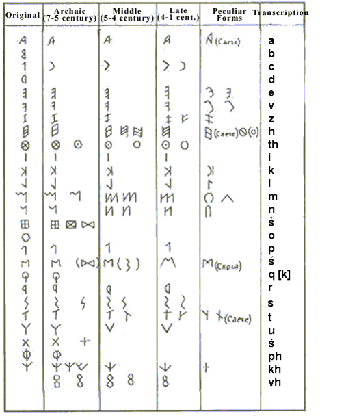К 700 году до н. э. этрусский алфавит состоял из 26 букв: