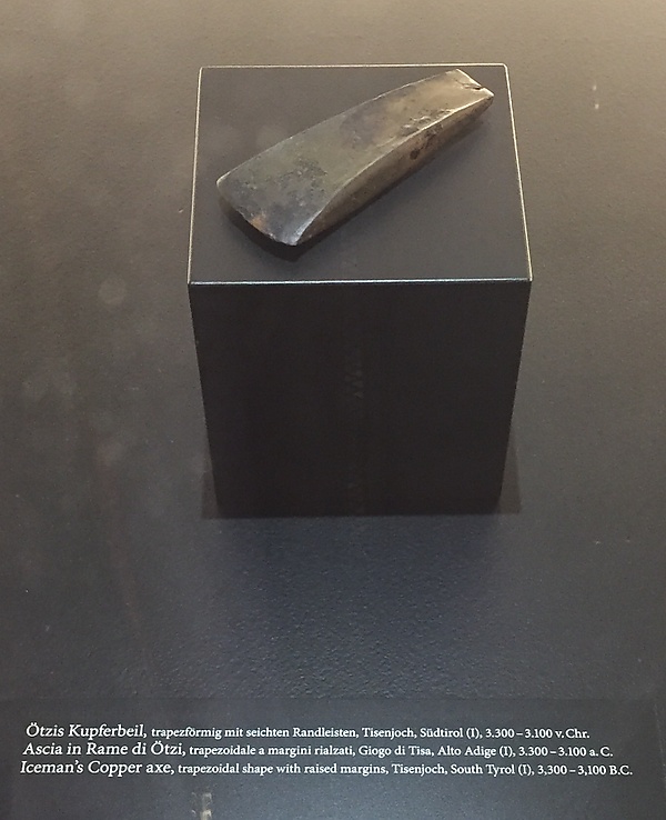 Медный топор является единственным прекрасно сохранившимся медным топором доисторического периода. Лезвие топора в форме трапеции, длиной 9,5 см, состоит на 99,7 % из меди. Тщательно отшлифованная рукоятка длиной 60 см сделана из тиса, для закрепления на ней лезвия была обмотана узкими полосками кожи. Также на лезвии топора зафиксированы следы заточки. По словам доктора Джильберто Артиоли (Dr. Gilberto Artioli) из Миланского университета, рабочая группа университетов Милан и Триент исследовала медный топор «ледяного человека» и некоторые другие топоры того же времени. С помощью быстрых нейтронов и рентгеновского излучения с высокой энергией возможно исследование структуры медных кристаллов внутри топора без повреждения самого предмета. Таким образом, можно в деталях реконструировать процесс создания предмета. Различия в структуре кристаллов меди позволяют сделать вывод, что толщина лезвия топора изменилась в процессе заточки. Можно предположить, что топоры из меди в 3000 году до н. э. могли принадлежать людям из высших слоёв общества, также они служили оружием. Это даёт повод думать, что «ледяной человек» был либо руководителем группы, либо воином.