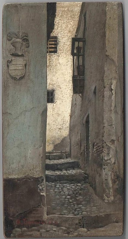 На полотне в жанре ведута изображён узкий переулок, вымощенный булыжником, вдоль которого расположены здания из серого камня. В левой верхней части этюда на стене одного из домов выделяется лепнина в виде рыцарского шлема, украшенного перьями, а также герб и неразборчивая надпись. На втором плане видна стена здания из белого камня, что придаёт изображению дополнительную глубину.