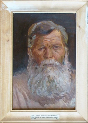 На полотне представлен портрет седобородого старика с широкими скулами и большим лбом; изображение выполнено строго в анфас. Лицо отличается заметной асимметрией: внешний угол правого глаза значительно ниже левого. Нос небольшой и короткий, лоб прорезан горизонтальными морщинами. Светлые волосы уложены на косой пробор. Фон картины выдержан в тёмно-коричневых тонах. Работа выполнена в технике пастозной живописи, с использованием тёплой цветовой гаммы, включающей медно-рыжие, бежевые и коричневые оттенки.