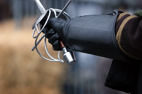 - Удерживает руку от соскальзывания (например, при нанесении рубящих ударов оружие может «вырваться» под воздействием центробежной силы, возникающей особенно если боец ослаб от усталости или ранен)