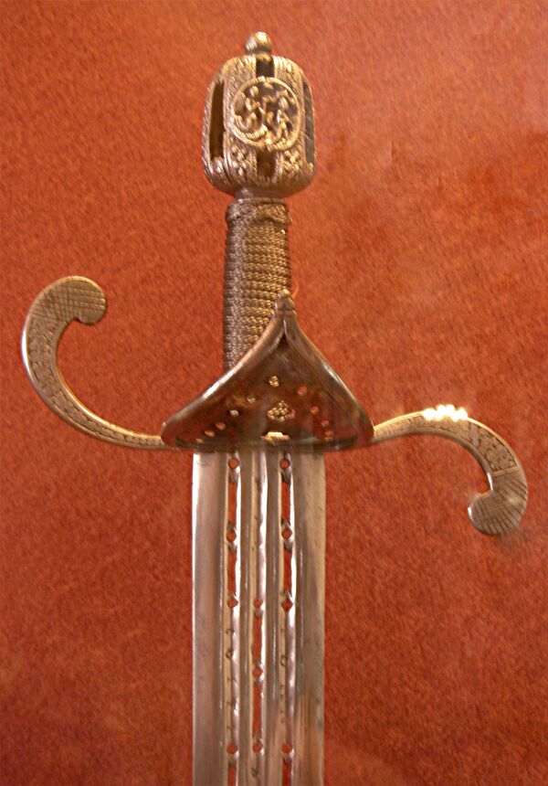 Эфес состоит из главной части — стебля[8] (рукоять с навершием), за который оружие держат одной рукой (двумя руками — двуручник), к нему по большей части прикрепляют металлическую дужку (гарду[9]) или чашку, защищающую кисть руки от ударов и уколов оружия противника.