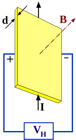 Если бы накопление заряда было положительным (как в некоторых металлах и полупроводниках), то значение VH на изображении было бы отрицательным (положительный заряд образовался бы на другой — левой стороне).