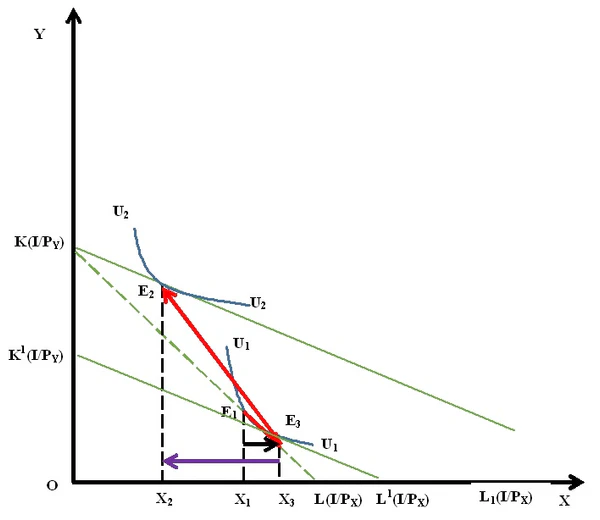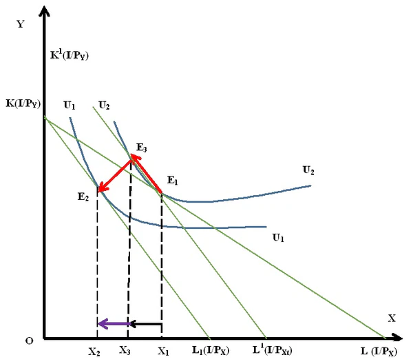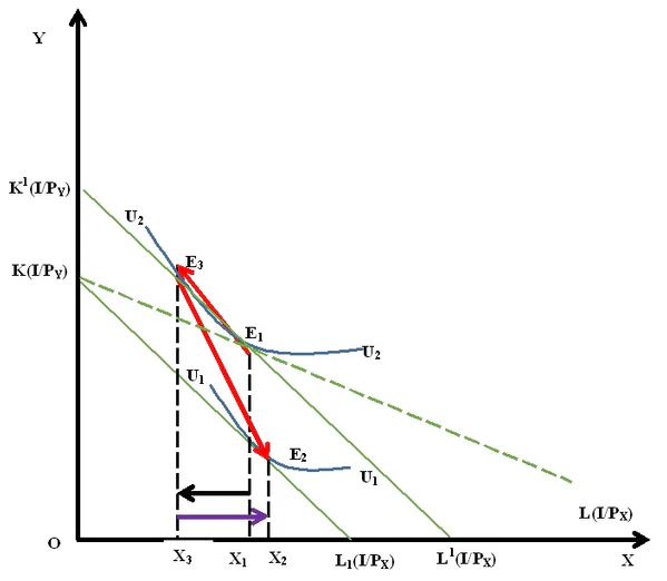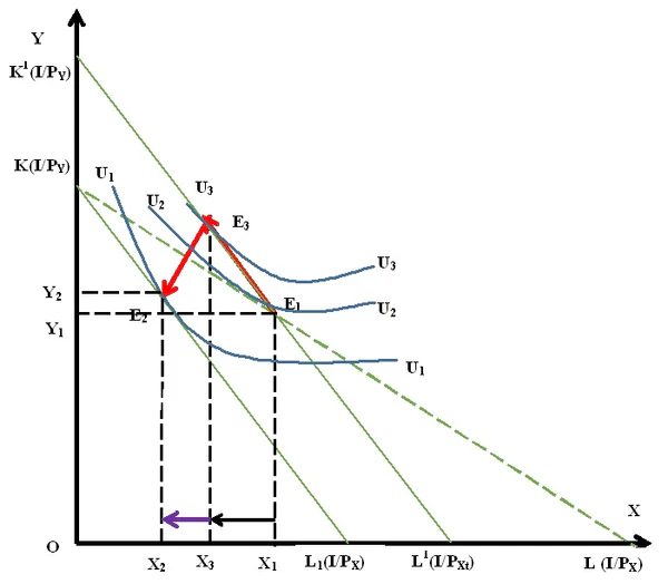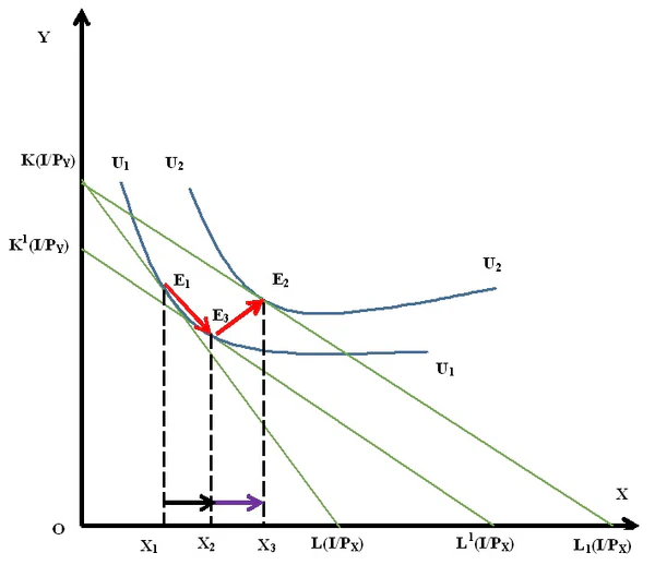 Согласно Хиксу, разные уровни денежного дохода с одним и тем же уровнем удовлетворения, лежащие на одной и той же кривой безразличия, представляют одинаковый уровень реального дохода. На рисунке 1 «Эффект дохода по Хиксу при снижении цены для нормального товара» бюджетная линия KL, равная доходу I и ценам РX и РY, касается с кривой безразличия U1U1 и определяет оптимум потребителя E1. В точке E1 объем потребления товара X равен X1. При снижении цены товара X до РXt и неизменном доходе I бюджетная прямая KL1 касается с более высокой кривой безразличия U2U2 в точке E2. В точке Е2 потребление товара X в объеме Х2. Таким образом, снижение цены товара X приводит к увеличению его потребления с Х1 до Х2. Бюджетная линия К1L1, параллельная линии KL1, с новым соотношение цен касается кривой безразличия U1U1 в точке Е3 и представляет прежний уровень удовлетворения. В точке E3 объём потребления товара Х3. При изменении первоначального к дополнительному оптимуму (от E1 к E3) реальный доход потребителя не меняется, остаётся на прежней кривой безразличия U1U1. Это эффект замены товара Y относительно подешевевшим товаром X, что равняется разности ОХ3 к ОХ1 (Х1Х3). А эффект дохода составляет разница ОХ2 к ОХ3 (Х3Х2). В результате действия эффекта дохода потребление обоих товаров в точке E2 выше, чем в точке E3[5].