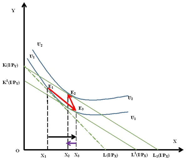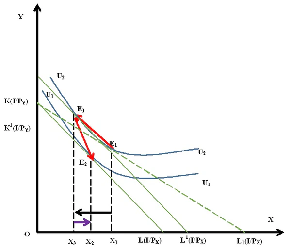 На рисунке 4 «Эффект дохода по Хиксу при повышении цены для неполноценного товара» общий эффект от повышения цены товара X - это отрезок (Х2Х1), который состоит на эффекта замены Х3Х1 и эффекта дохода Х3Х2, при этом (Х3Х1) > (Х3Х2)[5].