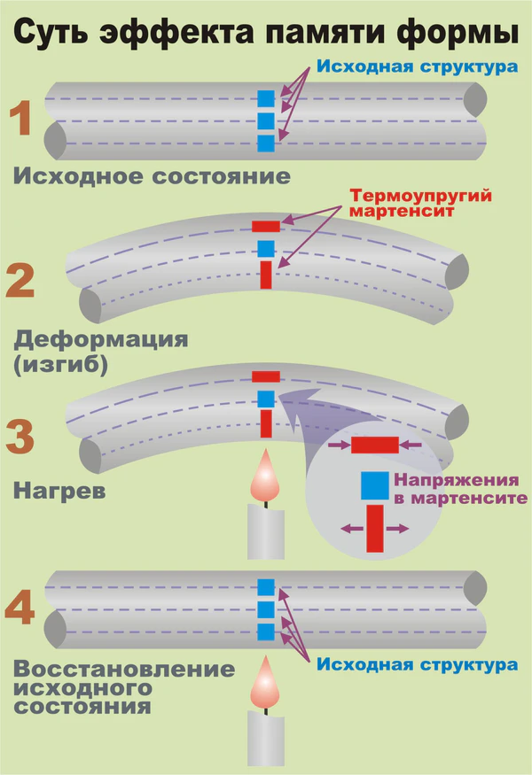- При деформации (в данном случае при изгибе) внешние слои материала вытягиваются, а внутренние сжимаются (средние остаются без изменения). Эти вытянутые структуры — мартенситные пластины, что не является необычным для металлических сплавов. Необычным является то, что в материалах с памятью формы мартенсит термоупругий.