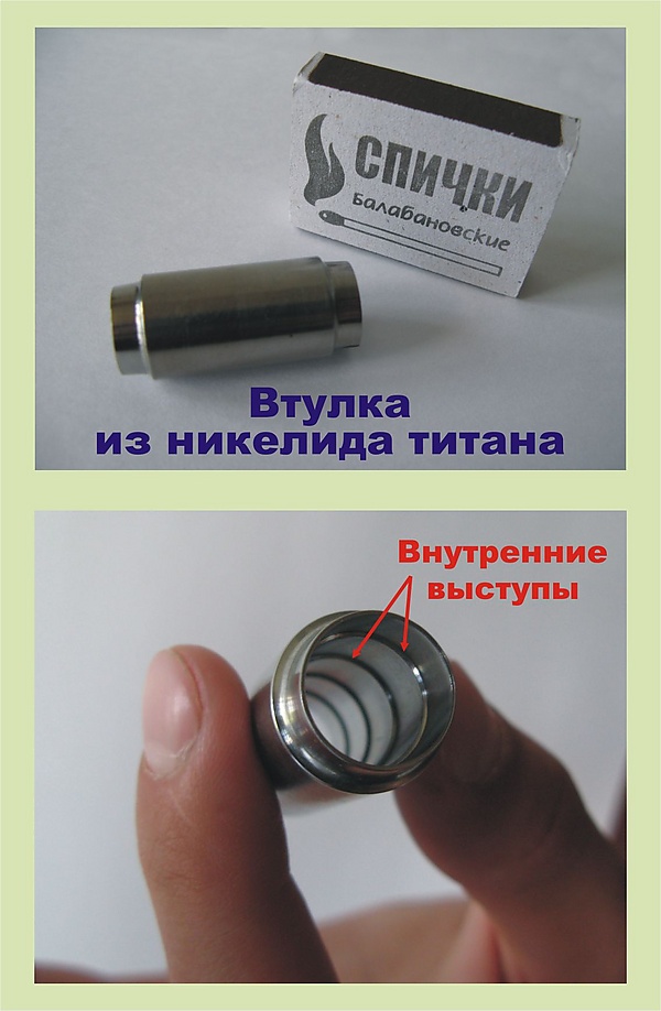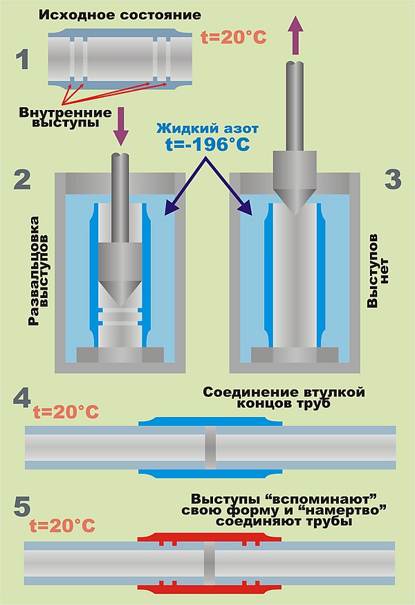 - Комнатная температура является температурой нагрева для данного состава сплава, при нагревании до которой все происходит автоматически: внутренние выступы восстанавливают свою исходную форму, выпрямляются и врезаются во внешнюю поверхность соединяемых труб.