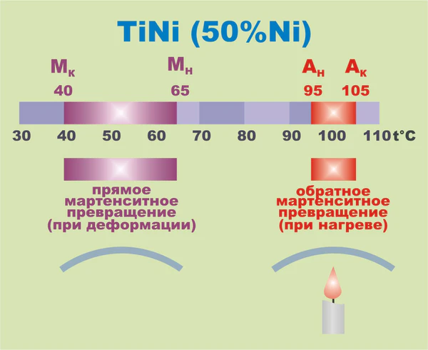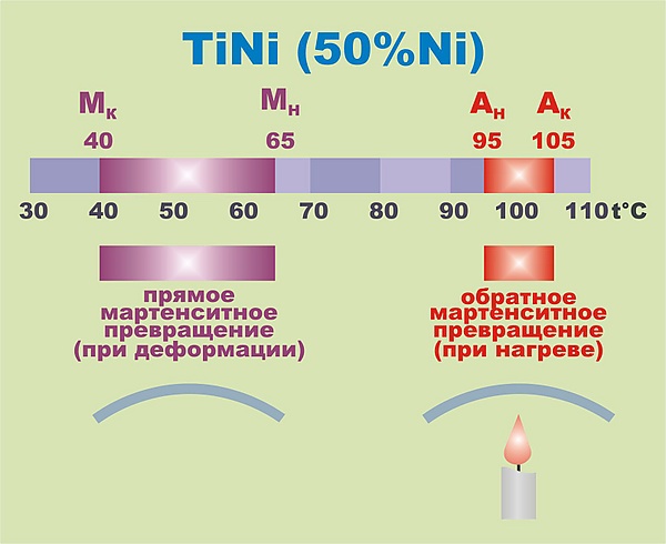 В процессе проявления эффекта памяти формы участвуют мартенситные превращения двух видов — прямое и обратное. Соответственно, каждое из них проявляется в своем температурном интервале: МН и МК — начало и конец прямого мартенситного превращения при охлаждении, АН и АК — начало и конец обратного мартенситного превращения при нагреве.