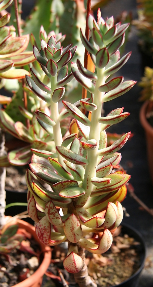 Суккулентное растение высотой 20 см. Листья с красной каймой по краю. Цветки красно-коричневые[2].