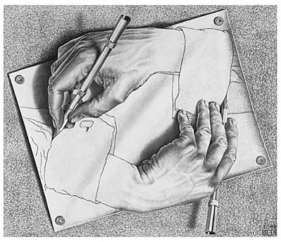 Наиболее очевидна тема самовоспроизведения в литографии «Рисующие руки»: хорошо прорисованы кисти рук, выходящие из ещё лишь набросанных манжетов; каждая из кистей рук рисует манжет соседней руки. Возникает «странная петля», в которой уровни рисующего и рисуемого взаимно замыкаются друг на друге[L 13].