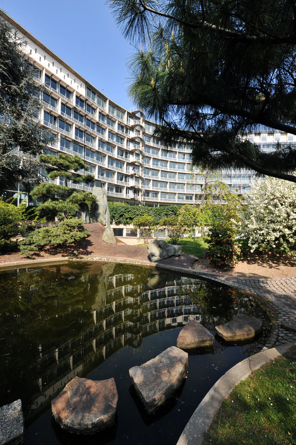 Современная штаб-квартира ЮНЕСКО была открыта 3 ноября 1958 года. Здание по форме напоминает латинскую букву Y и построено на 72 бетонных колоннах. В нём расположена библиотека организации. Комплекс на площади Фонтенуа дополняет здание, названное «аккордеон», в овальном зале которого проходят пленарные заседания Генеральной конференции, здание в форме куба и здание с шестью зелёными внутренними двориками, на которые выходят окна служебных кабинетов[ю. 24]. Архитекторами зданий стали представители разных стран: Марсель Брейер (США), Пьер Луиджи Нерви (Италия) и Зерфюс, Бернар (Франция)[ю. 25].