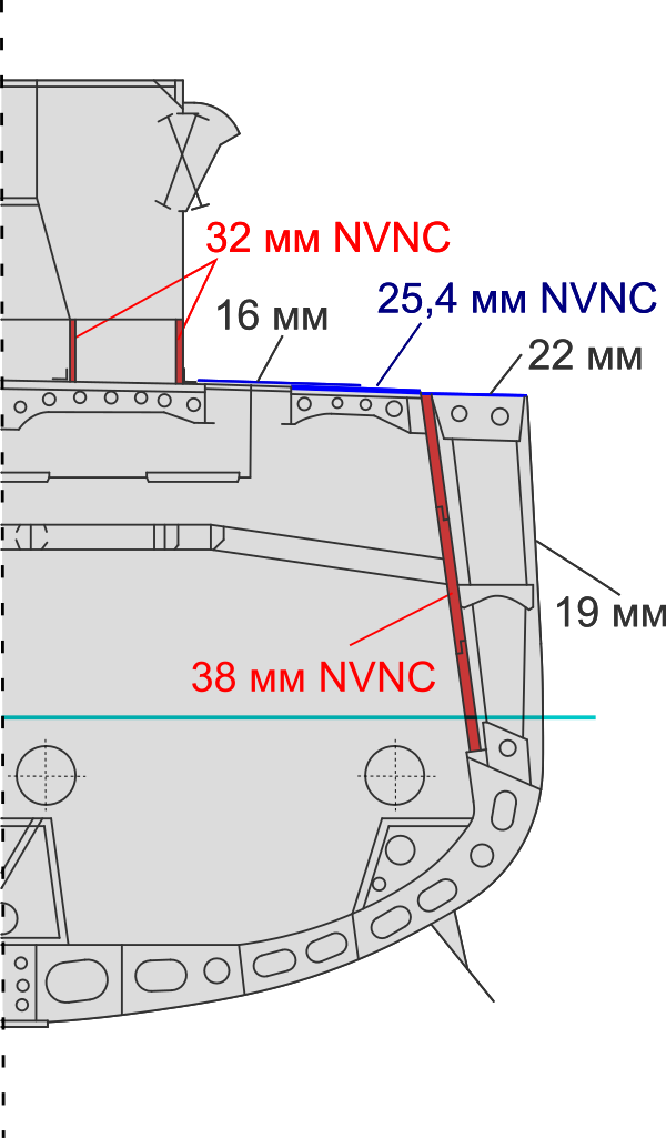 - Использование бортовой и палубной брони для увеличения продольной прочности корпуса, одновременно с отсутствием листов обшивки под вертикальным бронированием;