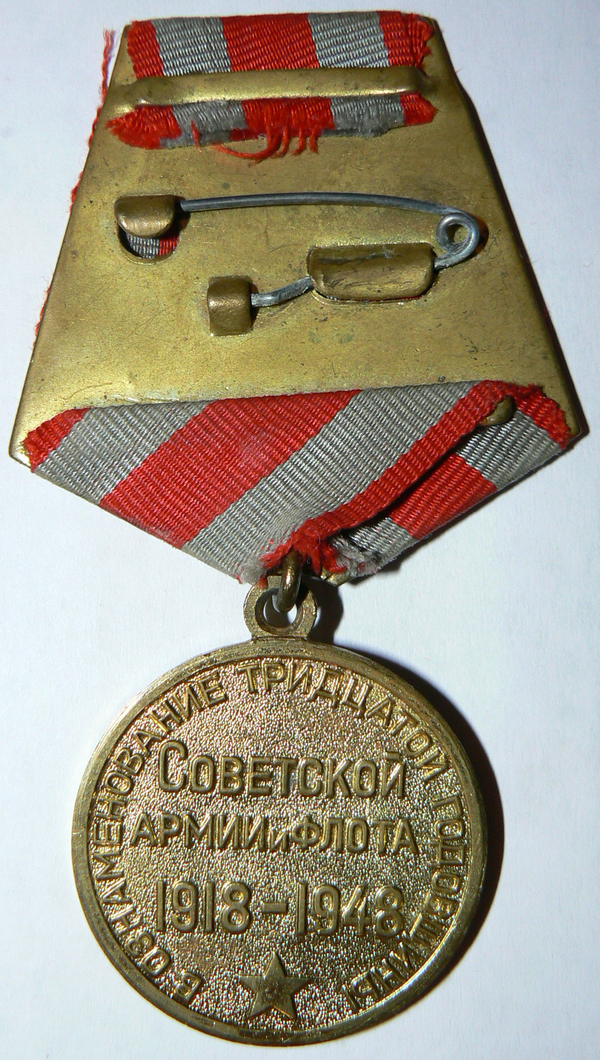 На оборотной стороне медали надпись — по окружности: «В ОЗНАМЕНОВАНИЕ ТРИДЦАТОЙ ГОДОВЩИНЫ», в центре: «СОВЕТСКОЙ АРМИИ И ФЛОТА» и дата «1918—1948».