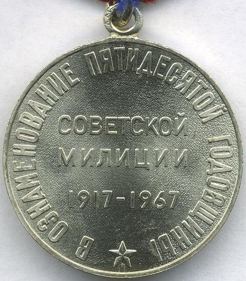 Юбилейная медаль «50 лет советской милиции» учреждена Указом Президиума Верховного Совета СССР от 20 ноября 1967 года в ознаменование 50-летия советской милиции.