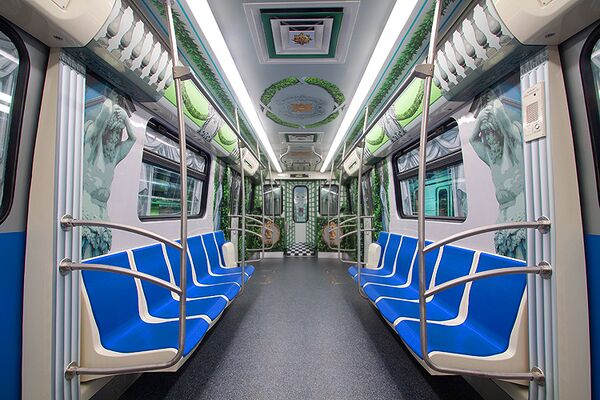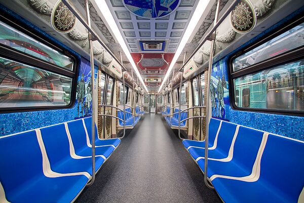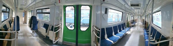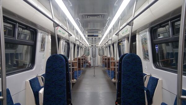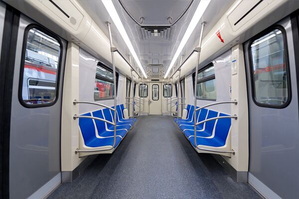 Потолок в салоне имеет плоскую форму и состоит из ряда стальных панелей[25]. По центру над проходом размещены выступающие из потолка решётки вентиляционных агрегатов, а по бокам от них вдоль салона две линии светодиодных светильников по одной с каждой стороны, применение которых в сравнении с люминесцентными светильниками на «Яузах» позволяет снизить энергопотребление. Решётки вентиляторов в потолке салона, в отличие от «Яузы», имеют не округлую, а квадратную форму), кроме того к потолку прикреплены дополнительные поручни дугообразной формы[6]. Поручни в салоне изготовлены из сатинированной нержавеющей стали[25].