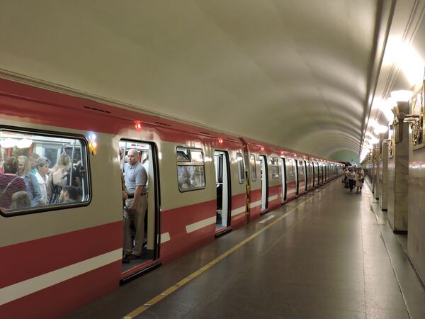 Электропоезд 81-722/723/724 отправляется от станции «Площадь Мужества»