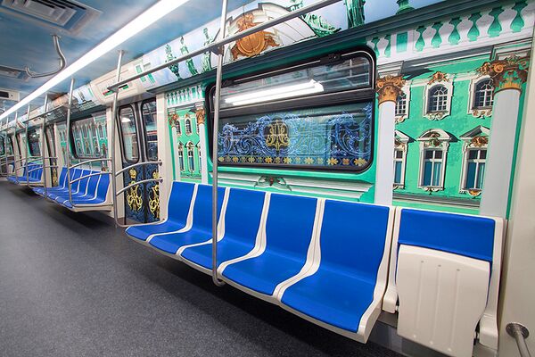 В отделке салона применены вандалостойкие материалы, позволяющие легко отмывать краску специальными средствами на основе слабощелочных растворов на водной основе и восстанавливать мелкие повреждения. Цветовая гамма салона электропоездов 81-722/723/724 оформлена следующим образом: стены салона имеют белый цвет, двери — серебристый, сиденья — синий. У части поездов стены, потолок и окна салона были обклеены красочными цветными аппликациями на тему архитектуры станций Санкт-Петербургского метрополитена, исторических зданий и памятников самого города[25]. У салона поездов 81-722.1/723.1/724.1 двери имеют красный цвет, а сиденья — тёмно-серый с жёлтыми и красными узорами.
