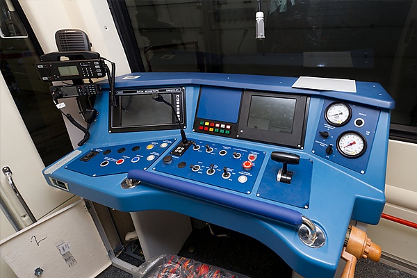 Для обеспечения комфортных условий работы машиниста в кабине имеются кресло с вибропоглощением и пневморегулированием высоты, противосолнечный защитный экран (при работе на наземных участках) и климатическая установка, которая обеспечивает вентиляцию, кондиционирование и отопление. Сверху перед лобовым стеклом в кабине размещено электронное табло маршрутного указателя, на котором показывается номер маршрута и станция назначения[25].