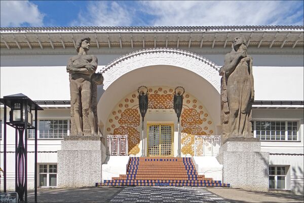 Колония художников в Дармштадте — это коллекция зданий в стиле югендстиль, созданная в 1899 году Эрнестом Людвигом, герцогом Гессенским, внуком королевы Виктории, с целью продвижения торговли и искусства. Он собрал группу дизайнеров для создания своего нового сообщества, в которую вошли Петер Беренс, Ханс Кристиансен и Йозеф Мария Ольбрих[5]. Архитектура колонии представляла собой полный разрыв с прежним цветочным стилем и была гораздо смелее в своём дизайне. Беренс и несколько других архитекторов построили там свои собственные дома и спроектировали каждую деталь, от дверных ручек до посуды[6].