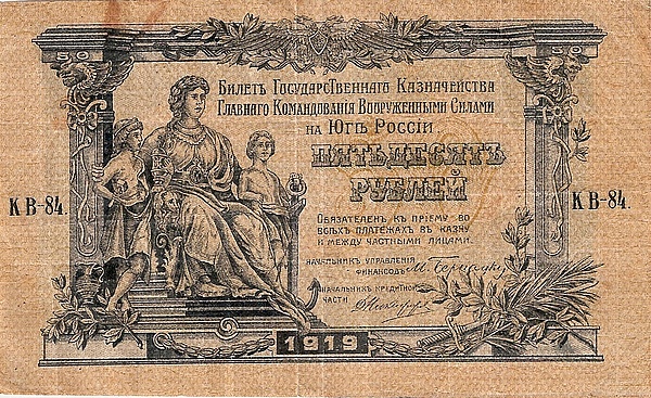 С 30 августа 1919 года началась осуществляться масштабная эмиссия новых добровольческих денег — так называемых деникинских «колокольчиков». Денежные знаки Юга России печатались в Ростове-на-Дону в здании бывшей конторы Государственного банка. К концу года колокольчики, однако, начали существенно обесцениваться из-за высоких темпов инфляции при лавинообразной эмиссии (150 деникинских рублей обменивались на 1 французский франк)[20]. Частично в магазинах, лавках, а также на некоторых предприятиях и в учреждениях началось кустарное изготовление собственных разменных знаков, выполнявших функции денег[21].