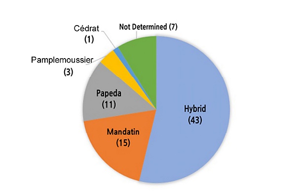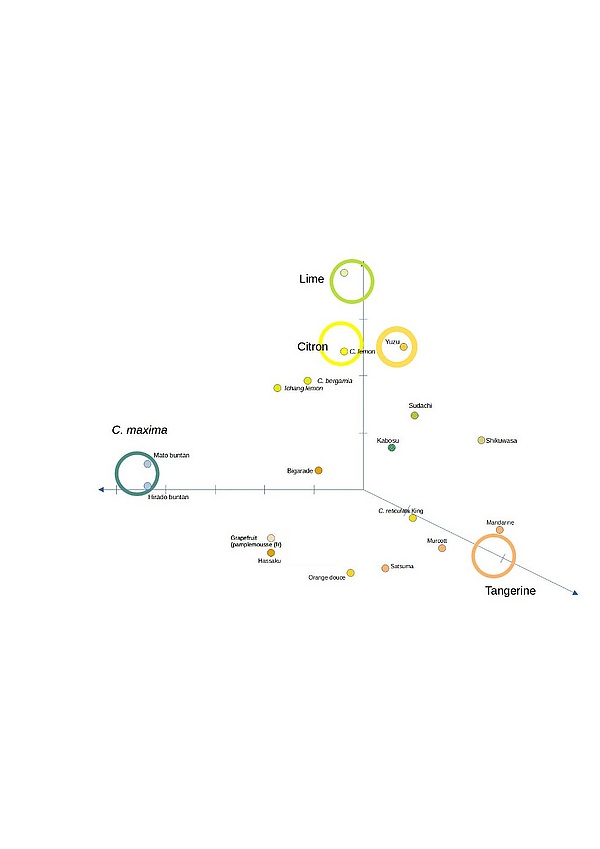 Мы собрали два образца юдзу из Японии: Nikou yuzu и Shingu yuzu. Оба образца клонально связаны с хпДНК C. ichangensis. Юдзу является межвидовым гибридом C. ichangensis × C. reticulata, а родителем C. reticulata был дикий мандарин mangshanyeju (MS). Интересно, что юдзу — единственный известный межвидовой гибрид с чистым родителем MS. Татибана — гибрид между mangshanyeju и обычным мандарином. Чистое происхождение от mangshanyeju, свойственное юдзу, может объясняться географической близостью популяций дикого ичанского лимона и mangshanyeju. Регион Маншань может быть местом рождения юдзу.