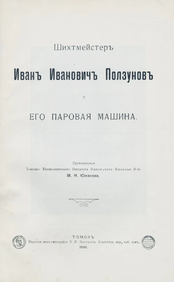 - Шихтмейстер И. И. Ползунов и его паровая машина // Известия Томского технологического института Императора Николая II — Т. 4, 1907, No. - Томск, 1907.