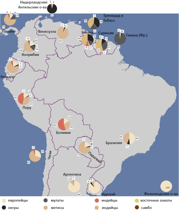 На этническом уровне население Южной Америки можно разделить на три типа: индейцы, белые и негры. В таких странах, как Колумбия, Эквадор, Парагвай и Венесуэла в демографическом плане преобладают метисы (потомки браков испанцев и туземного населения). Лишь в двух странах (Перу и Боливии) индейцы образуют большинство. В Бразилии, Колумбии и Венесуэле проживает значительное число населения африканского происхождения.