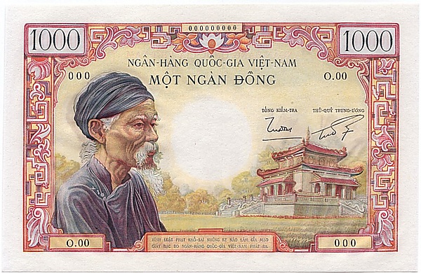 | 1000 донгов | Разноцветный | Старик, храм хунгвыонгов в Сайгоне | Женщина, лодка | Женская голова | 1955 | |||