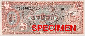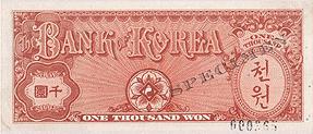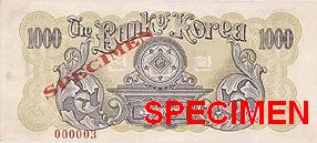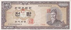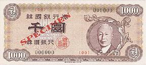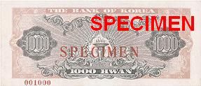 | 1000 хванов | 166 × 73 мм | Ли Сын Ман | Символ Банка Кореи | 26.03.1957 | |||