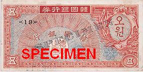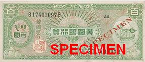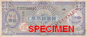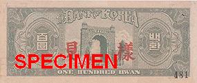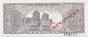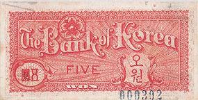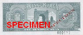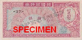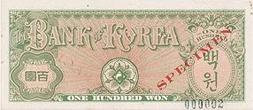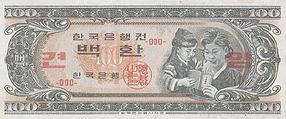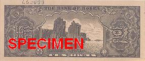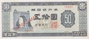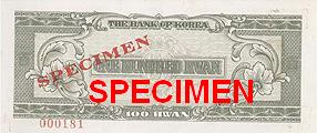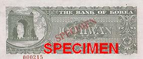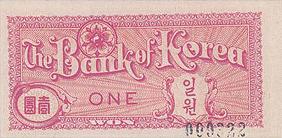 | 1 хван | 111 × 54 мм | розовый | Название банка, номинал | Символ Банка Кореи | 17.02.1953 | 10.06.1962 | ||