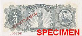 | 10 хванов | 156 × 66 мм | фиолетовый | Название банка, номинал, Корабль-черепаха | Символ Банка Кореи | ||||