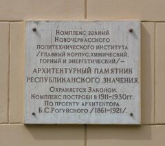 «Комплекс зданий Новочеркасского политехнического института (Главный корпус. Химический. Горный и энергетический) — архитектурный памятник республиканского значения. Охраняется Законом. Комплекс построен в 1911—1930 гг. По проекту архитектора Б. С. Рогуйского (1861—1921)».