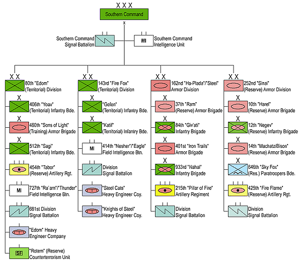 - 143-я территориальная дивизия «Шуалей ха-Даром» (ранее — 643-я) («дивизия сектора Газа») (ивр. אוגדת עזה);