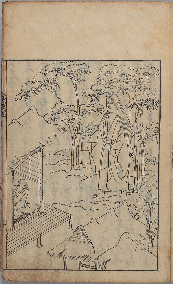Эта композиция продолжает тему мстительных злых духов, но переносит акцент на доблестную даму. Безногое привидение юрэй в ночном небе — это дух придворного Сасаки-но Киётака, который убедил императора, властолюбивого Го-Дайго (1288-1339), вступить в битву с силами даймё Асикага Такаудзи. В результате императорское войско было наголову разбито при реке Минато-гава (1336), и Го-Дайго со своим двором был вынужден бежать в горную местность Ёсино. Придворная дама Ига-но Цубонэ 伊賀の局, состоявшая в свите императрицы, обеспечила переправу через разлившуюся реку, повалив дерево и перекинув его с берега на берег. Она же помогла усмирить дух Киётаки, которому после поражения было предписано совершить харакири. Он совершил, но обиделся и стал пугать по ночам императора и остатки его двора. Неустрашимая Ига-но Цубонэ, отправилась ночью в сад, вооруженная лишь фонарем со светлячками, вступила в беседу с привидением и, пообещав помолиться за него, убедила его больше не появляться. Хрупкая красавица в громоздких одеждах у Хокусая полностью соответствует условностям изображения придворных дам древности, но мало сочетается с представлением о ее силе и храбрости. Впрочем, Ёситоси в уже упоминавшейся серии «Сто видов луны» перерисовал всю сцену близко к Хокусаю.[9]