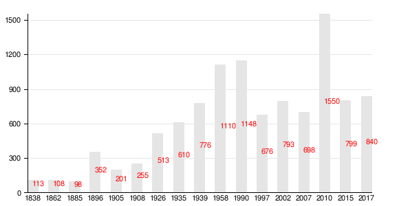 Изменение численности населения за период с 1838 по 2017 год: