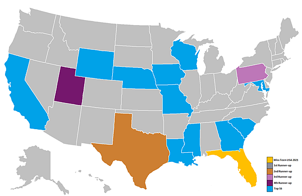 Участницы 50 штатов и округа Колумбия были выбраны на конкурсах штатов, которые проводились с сентября 2020 года. Первыми штатами, где были проведены конкурсы стали Айдахо и Монтана, проведённые 27 сентября 2020 года, а последним штатом стал Калифорния, проведённый 11 сентября 2021 года.