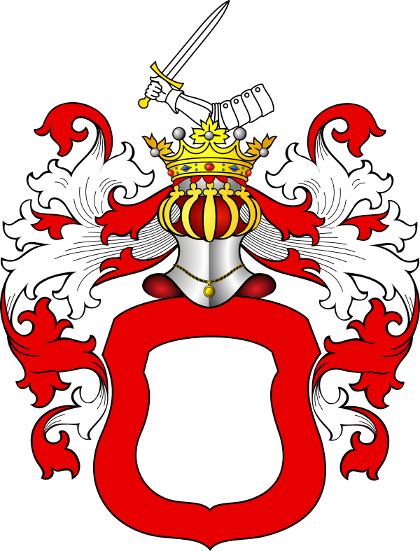 Щит увенчан дворянскими шлемом и короной. Нашлемник: вооружённая мечом рука. Намёт на щите красный, подложенный серебром.