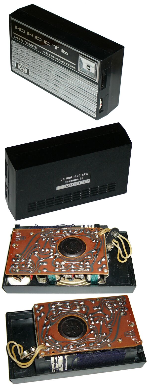 «Обилие интересных схемотехнических решений позволило нашему заводскому КБ не только доработать „Юность 105“, но и модернизировать его предыдущую модель — „Юность КП-101“, а также разработать ещё один набор — „Юность-мини“, из деталей которого можно собрать малогабаритный радиоприёмник, рассчитанный на работу с миниатюрным головным телефоном.»[4]
