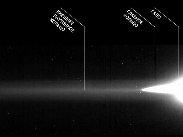 Главное кольцо простирается от 122 500 до 129 230 км от центра Юпитера. Внутри главное кольцо переходит в тороидальное гало, а снаружи контактирует с паутинным. Наблюдаемое прямое рассеяние излучения в оптическом диапазоне характерно для пылевых частиц микронного размера. Однако пыль в окрестности Юпитера подвергается мощным негравитационным возмущениям, из-за этого время жизни пылинок 103±1 лет. Это означает, что должен быть источник этих пылинок. На роль подобных источников подходят два малых спутника, лежащих внутри главного кольца — Метида и Адрастея. Сталкиваясь с метеороидами, они порождают рой микрочастиц, которые впоследствии распространяются по орбите вокруг Юпитера. Наблюдения паутинного кольца выявили два отдельных пояса вещества, берущих начало на орбитах Фивы и Амальтеи. Структура этих поясов напоминает строение зодиакальных пылевых комплексов[42].