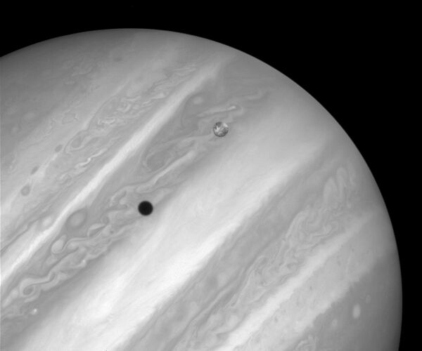 Сперва в 1973 году, а затем в 1974-м мимо Юпитера прошли «Пионер-10» и «Пионер-11»[14] на расстоянии (от облаков) 132 тыс. км и 43 тыс. км соответственно. Аппараты передали несколько сотен снимков (невысокого разрешения) планеты и галилеевых спутников, впервые измерили основные параметры магнитного поля и магнитосферы Юпитера, были уточнены масса и размеры спутника Юпитера — Ио[14][83]. Именно во время пролёта мимо Юпитера аппарата «Пионер-10» с помощью аппаратуры, установленной на нём, удалось обнаружить, что количество энергии, излучаемой Юпитером в космическое пространство, превосходит количество энергии, получаемой им от Солнца[14].