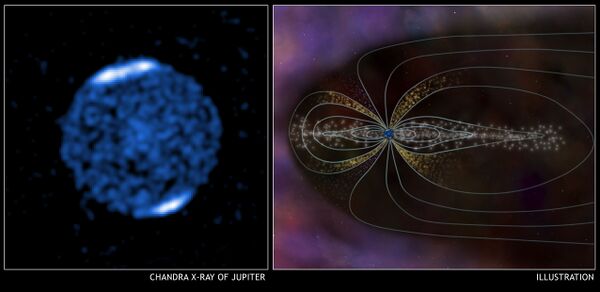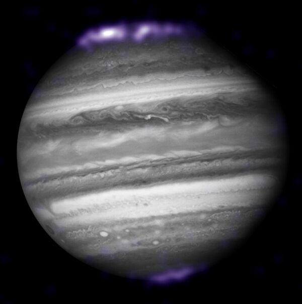 На Земле области полярных сияний в рентгене и ультрафиолете практически совпадают, однако на Юпитере это не так. Область рентгеновских полярных сияний расположена гораздо ближе к полюсу, чем ультрафиолетовых. Ранние наблюдения выявили пульсацию излучения с периодом в 40 минут, однако в более поздних наблюдениях эта зависимость проявляется гораздо хуже. Ожидалось, что рентгеновский спектр авроральных сияний на Юпитере схож с рентгеновским спектром комет, однако, как показали наблюдения на рентгеновской орбитальной обсерватории «Чандра», это не так. Спектр состоит из эмиссионных линий с пиками у кислородных линий вблизи 650 эВ, у OVIII линий при 653 эВ и 774 эВ, а также у OVII на 561 эВ и 666 эВ. Существуют также линии излучения при более низких энергиях в спектральной области от 250 до 350 эВ, возможно, они принадлежат сере или углероду[20].
