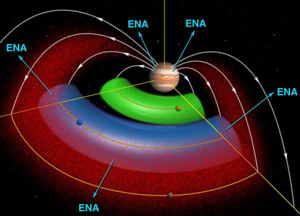Излучение Юпитера в гамма-диапазоне связано с полярным сиянием, а также с излучением диска[18]. Впервые зарегистрировано в 1979 году космической лабораторией имени Эйнштейна[19].
